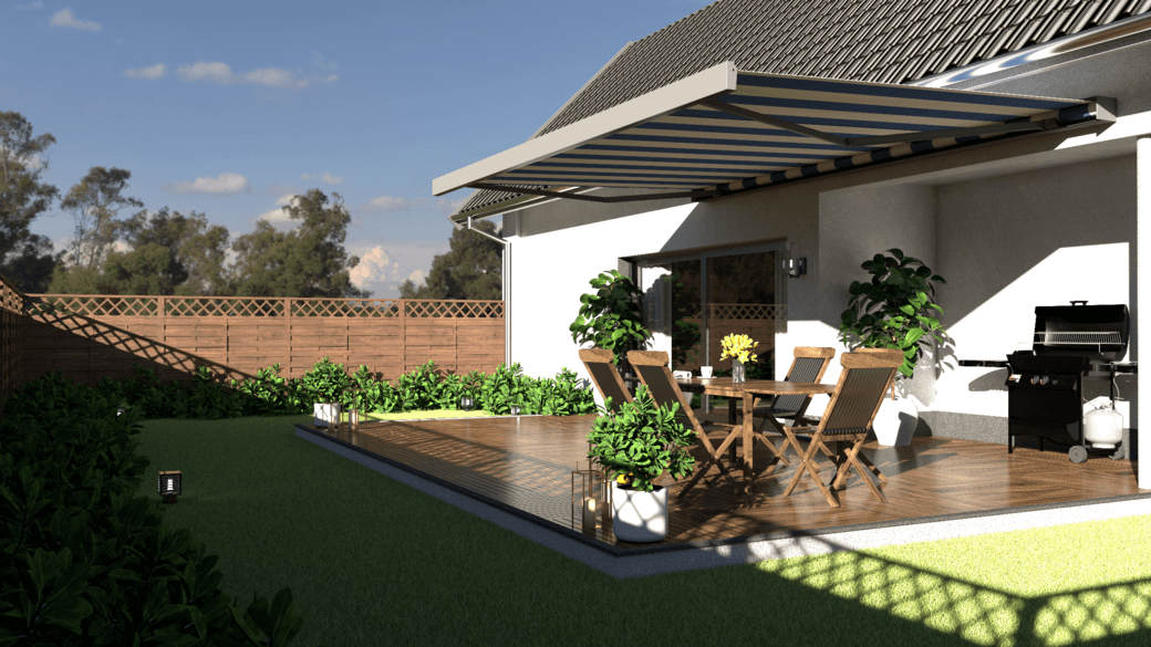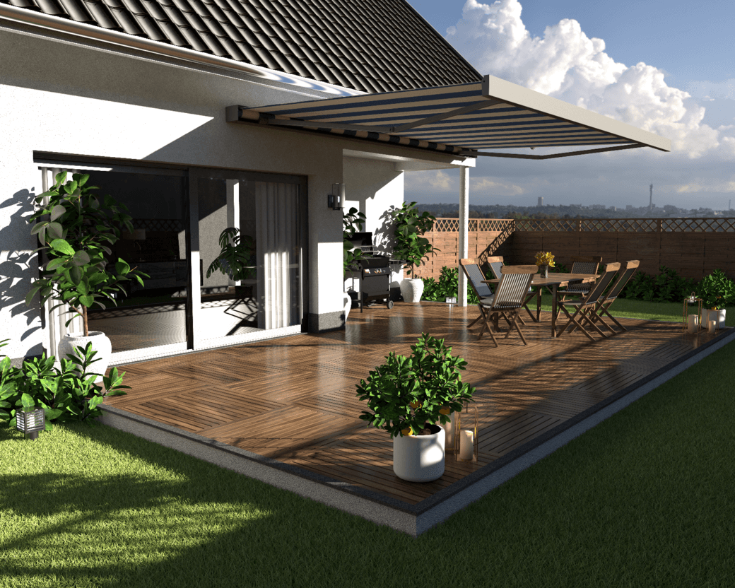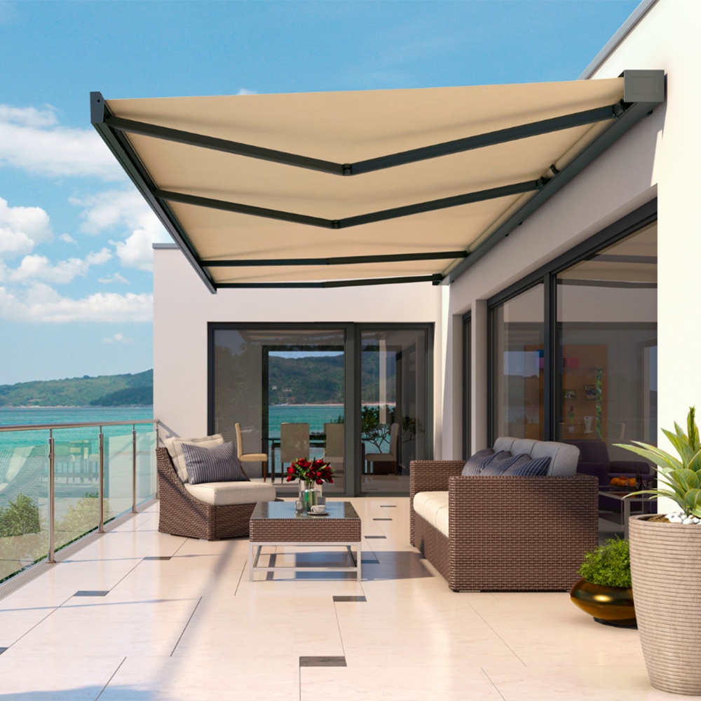 Die puristische Kastenmarkise K450 zeichnet sich durch ihr kompromissloses Design aus: Rechte Winkel und gerade Linien erinnern an den Bauhausstil. Dank ihrer strengen Form fügt sie sich ideal in die geometrische Architektur moderner Wohnimmobilien. Mit der geraden Fallstange lässt sich die K450 perfekt in Fassaden integrieren. Bei einer maximalen Fläche von bis zu 28 Quadratmetern beschattet sie auch größere Terrassen.