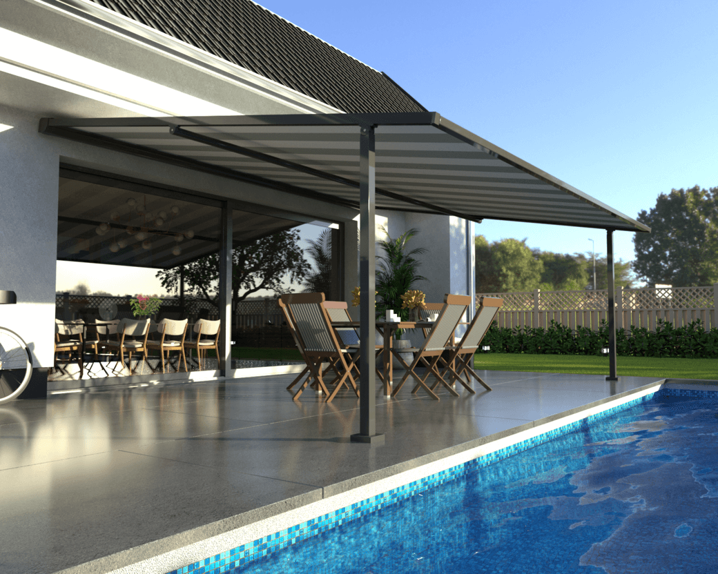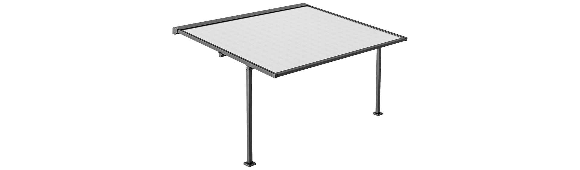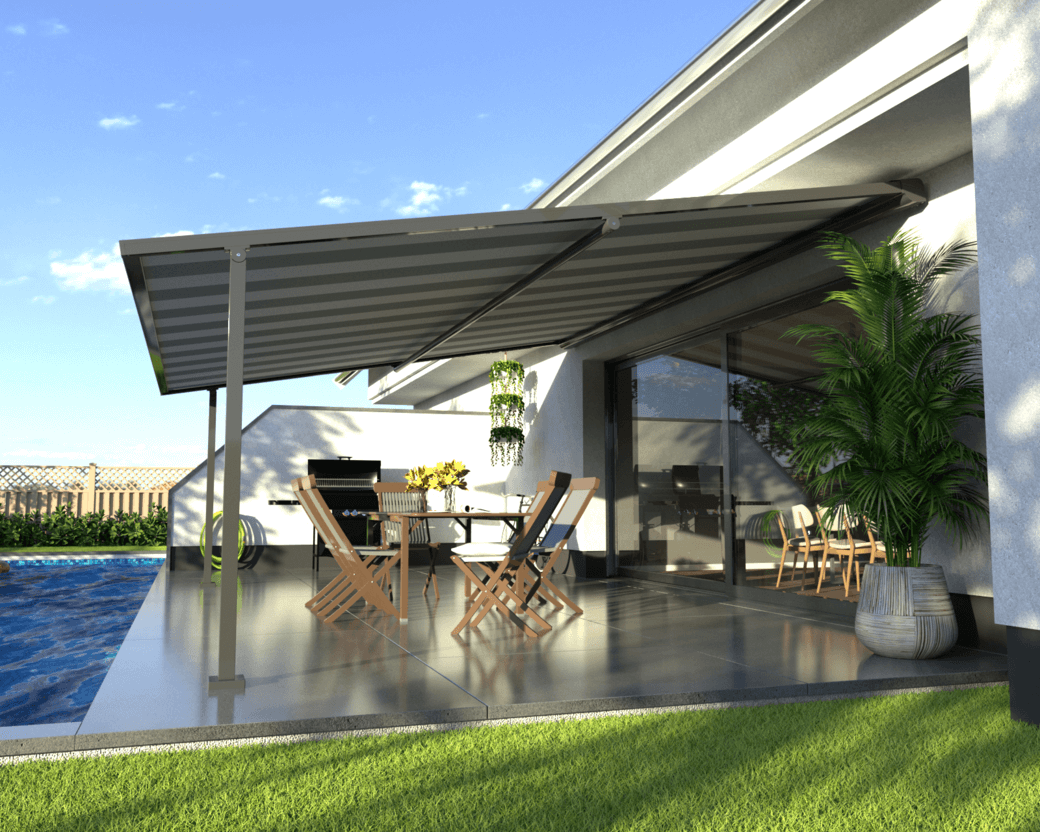 Der Markisenkasten glänzt mit seinem dynamischen Design: Abgerundete Ecken und geprägte Linien leiten den Blick schwungvoll von der Rückwand zur Führungsschiene.